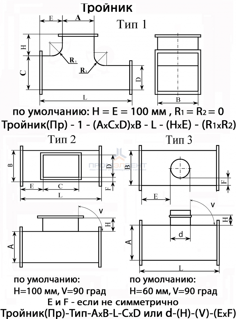 Тройник представляет собой прямой участок воздуховода и врезанной в него врезки. Тройник прямоугольного сечения может быть с прямоугольной врезкой или с круглой врезкой. Врезка в тройнике устанавливается под углом 90 градусов, либо под углом 45 градусов.
